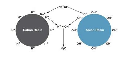 2 Tái sinh hạt nhựa trao đổi ion: Nước muối bão hòa được dẫn qua các hạt nhựa trao đổi ion, giúp loại bỏ các ion canxi và magie tích tụ, thay thế bằng ion natri.